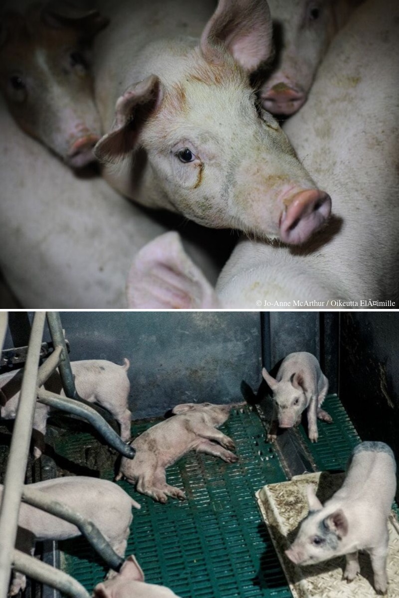 The pigs will reach their “finished weight” when they’re just 20 to 24 weeks old, at which point they’ll be packed onto a lorry and sent to the abattoir. At the end of this terrifying journey, the animals are typically stunned with electric tongs or suffocated with carbon dioxide in a gas chamber before their throats are slit and they’re left to bleed out.