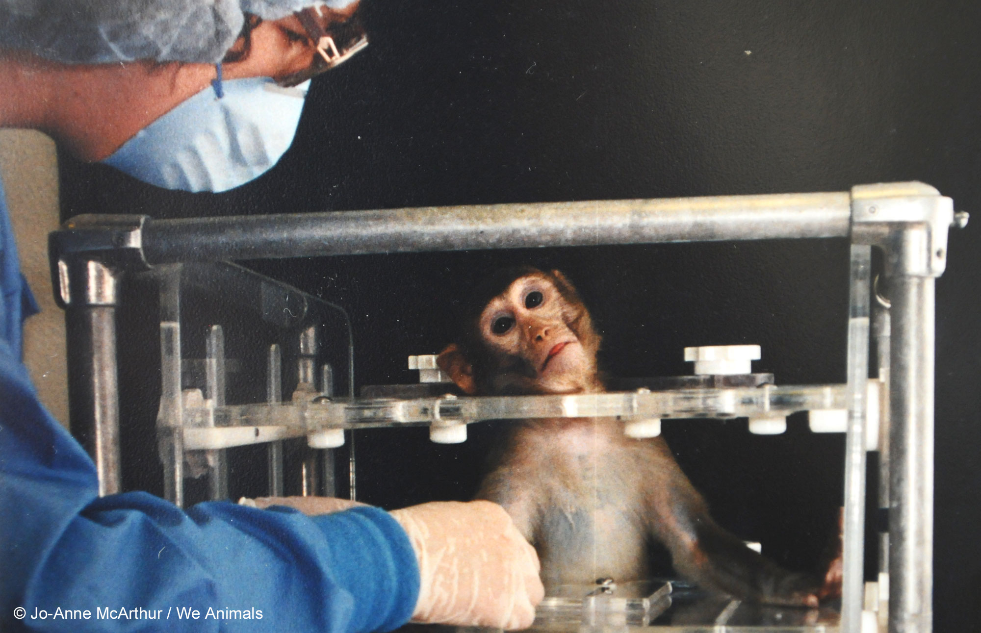 Once monkeys arrive in the U.S., they are offloaded from the planes by cargo-handling agents and left trapped in the cramped wooden crates (which are often filled with feces and urine) on the tarmac or loaded with forklifts into a warehouse. These sensitive monkeys must then wait in fear until they’re loaded into trucks and transported to facilities for quarantine. Then they’re moved yet again to laboratories where more horrors await. They’re imprisoned in cramped cages and often cut open, poisoned, crippled, addicted to drugs, shocked, and killed.
