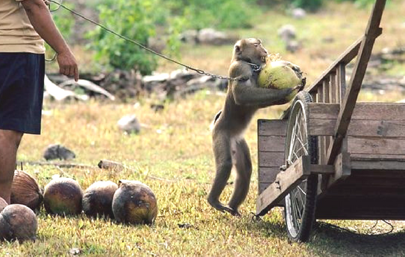 The monkeys are trained to harvest as many coconuts as possible. They are supposed to harvest up to 1,000 coconuts per day.