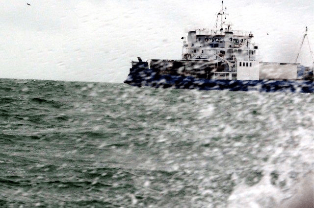 Above – the Joline in the English Channel in rough weather. Note loaded livestock transporters on deck.