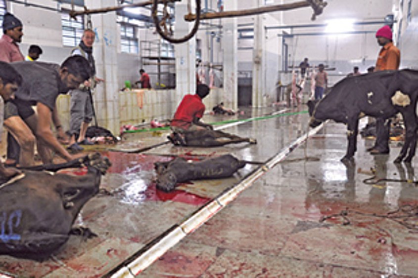 In the Indian slaughterhouses they are often cut open with dirty, blunt knives in front of their conspecifics, and some animals are even skinned and cut up when fully conscious.