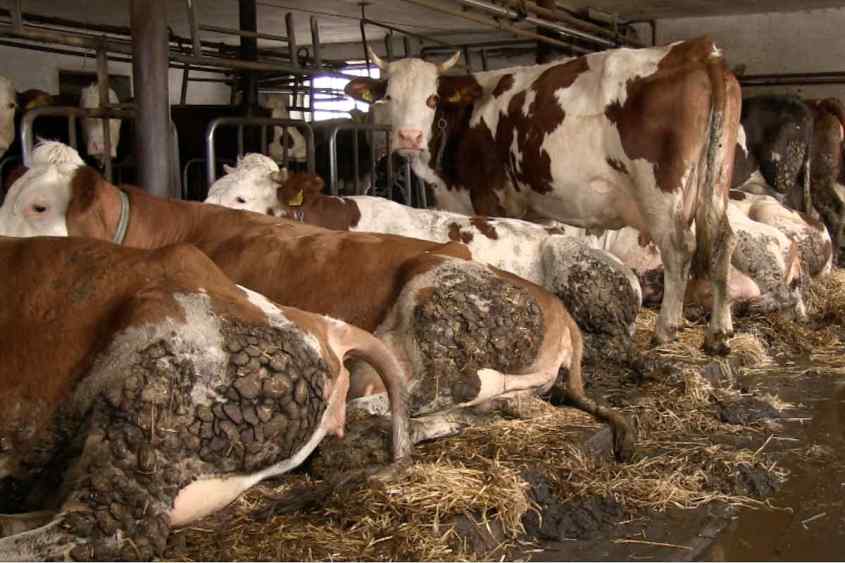 Their entire life the cows live in a dark barn that is dirty with feces. Lying in one’s own excrement causes protracted and painful udder diseases and skin wounds.