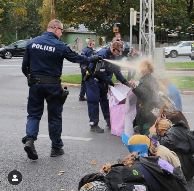 The Helsinki Police Department has been accused of breaching human rights after footage was shared widely online showing officers pepper-spraying sitting Extinction Rebellion (XR) protesters.