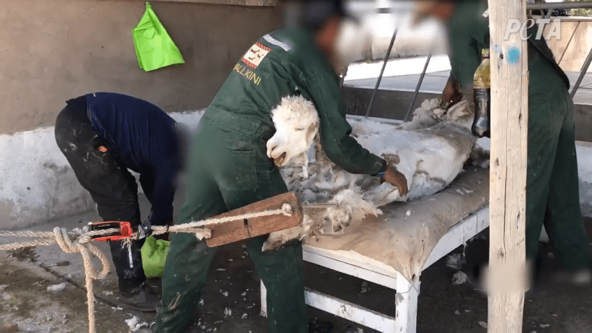 Workers sheared the animals roughly and carelessly, leaving them with gaping, bloody wounds that they crudely sewed shut.