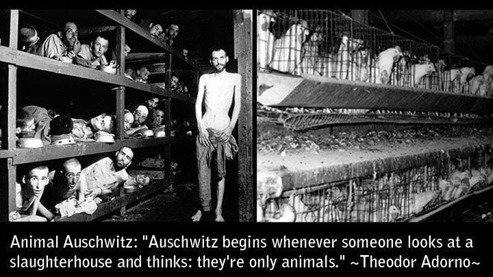 Children behind barbed wire. Next to it, piglets behind bars. One was a Nazi concentration camp. The other is a slaughterhouse.