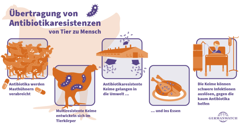Germanwatch recommends to consumers to avoid cheap chicken and to switch to organic products from smaller, farm-based livestock farms where – if at all – significantly lower resistance rates are found.