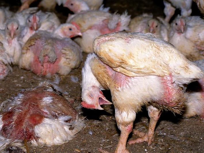 Many chickens waiting for slaughter develop various infections and diseases, and aside from the absence of veterinary care, there is no health inspection conducted on the birds who will soon become food.