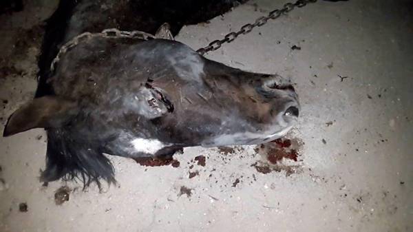 Argentina, a slaughterhouse in Land L: Injured horses are pulled from the transporters with chains and left to die.
