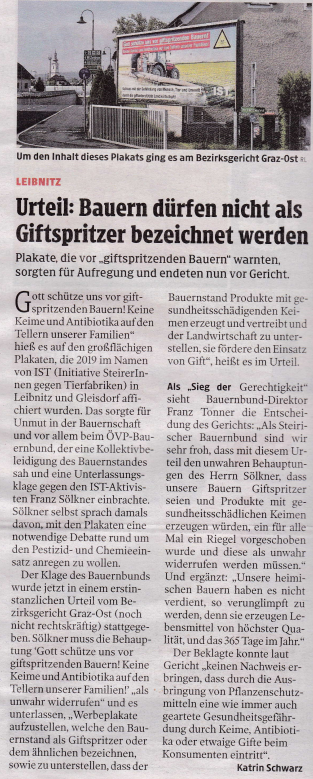 Therefore, the citizens ‘initiativemust revoke the statement as untrue, publish the revocation in the “Kleine Zeitung” (small Newspaper) and on a poster for a fee, and pay the farmers’ union money(!!!)