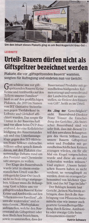 Therefore, the citizens ‘initiative must revoke the statement as untrue, publish the revocation in the “Kleine Zeitung” (small Newspaper) and on a poster for a fee, and pay the farmers’ union money(!!!)