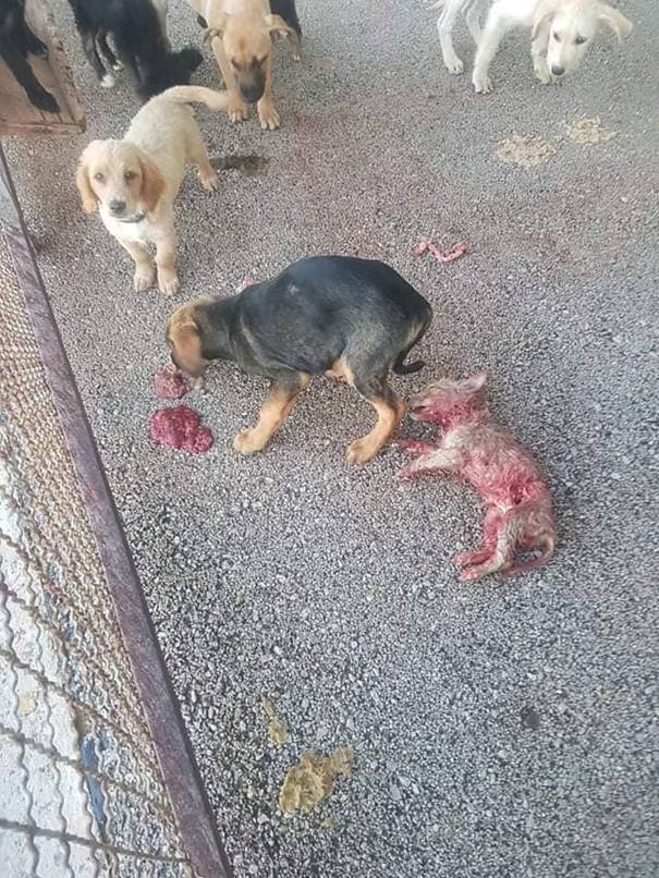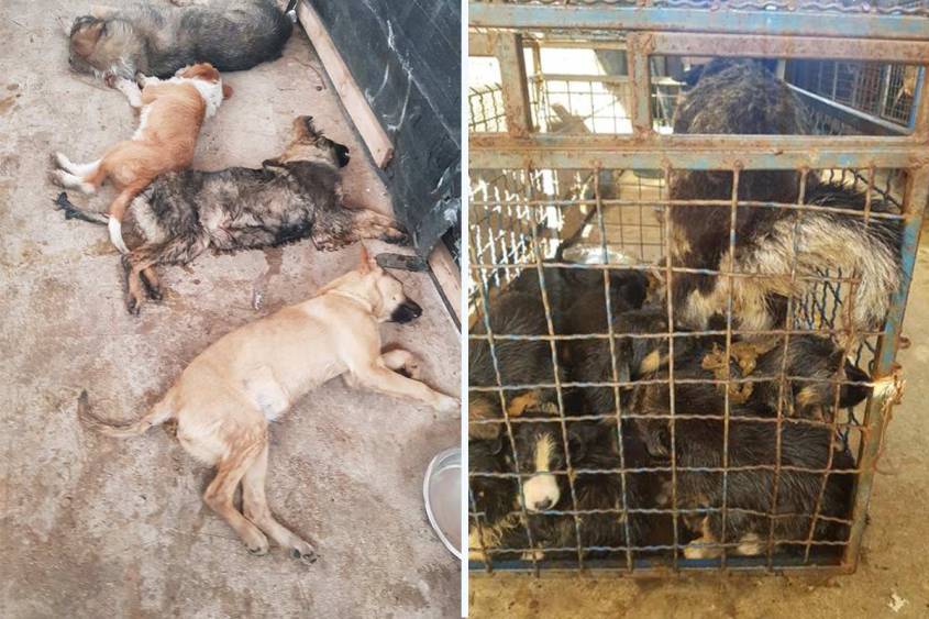 The images show the rotting bodies of deceased puppies, dogs with sad eyes that are vegetating in their own feces and urine, dirty, empty bowls.