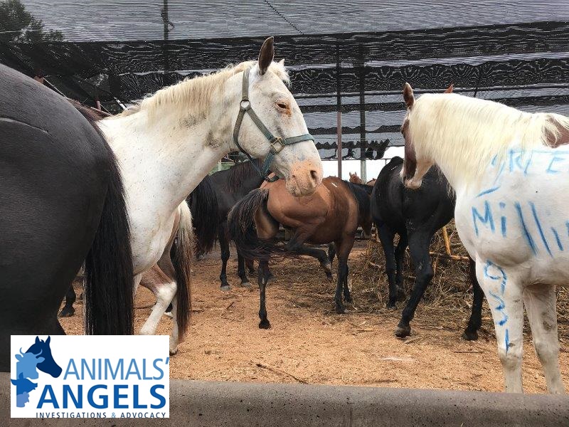 At the same auction, investigators saw a horse covered with dozens of whip marks, and witnessed a horse being kicked in the face by another horse with full force in an agitated pen.