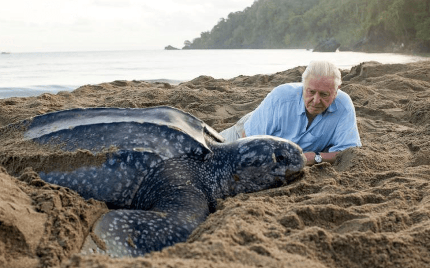 David Attenborough with a turtle on the beach. Photo: AFP/Mandel Ngan (maybe two of the same age?)