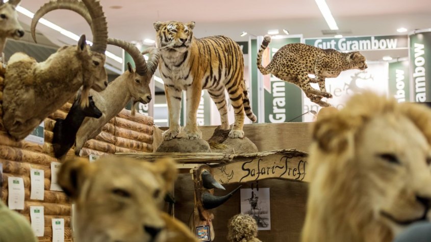The hunt for endangered and protected species is advertised at the exhibition stands via price lists, special offers, hunting videos and photos of killed animals.