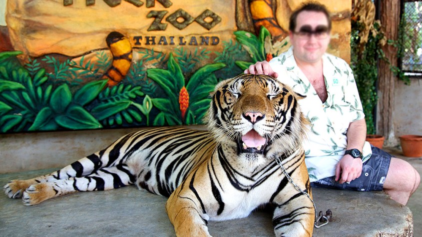 Here, visitors are encouraged to photograph a tiger in an ‘African’ landscape. The tiger is pushed and prodded with a bamboo stick wielded by a Tarzan-style trainer until the animal sits on a stool.