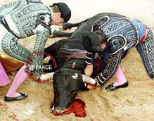 In bullfights, the bulls are beaten to exhaustion with lances and wooden sticks with barbs.