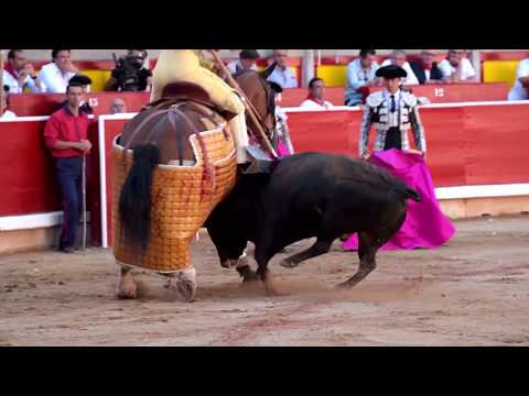 The damaging of the muscles of the bulls necks with the pica, a spiked lance. This is done by the picador, a man mounted on a horse. The horse is blindfolded, has his ears stuffed with wads of newspaper and on occasions has his vocal chords cut. The horse is covered with padding.