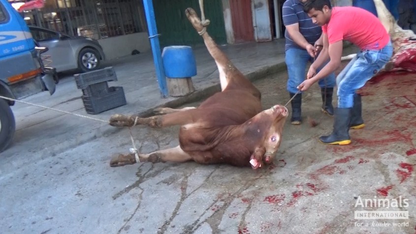 Being euthanized in most cases without prior stunning, bled to death while conscious.