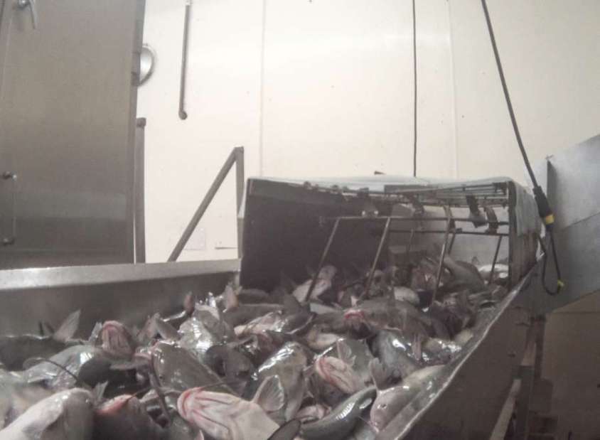 Simmons’ catfish are transported out of its ponds and into the slaughterhouse by a truck, where they are then dumped onto a conveyor that leads them to machines for stunning and beheading.