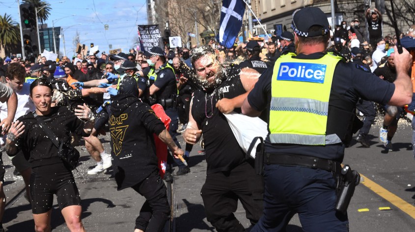 Police pepper spray protesters during an anti-lockdown rally in Melbourne on August 21, 2021. © AFP / William West