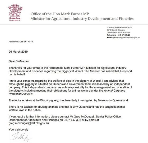 More than 3000 people sent emails of concern to the Minister for Agriculture. A couple of weeks later his office sent out a generic reply showing very little concern:.