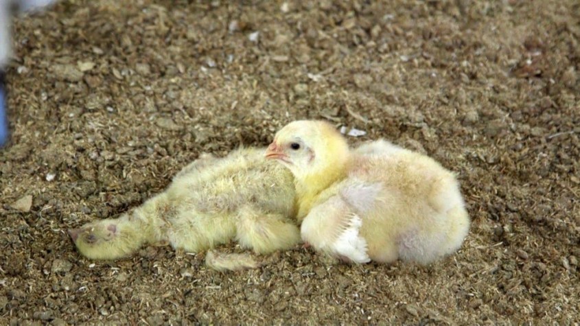 A Chick in an indoor industrial farming system sits beside a dead chick