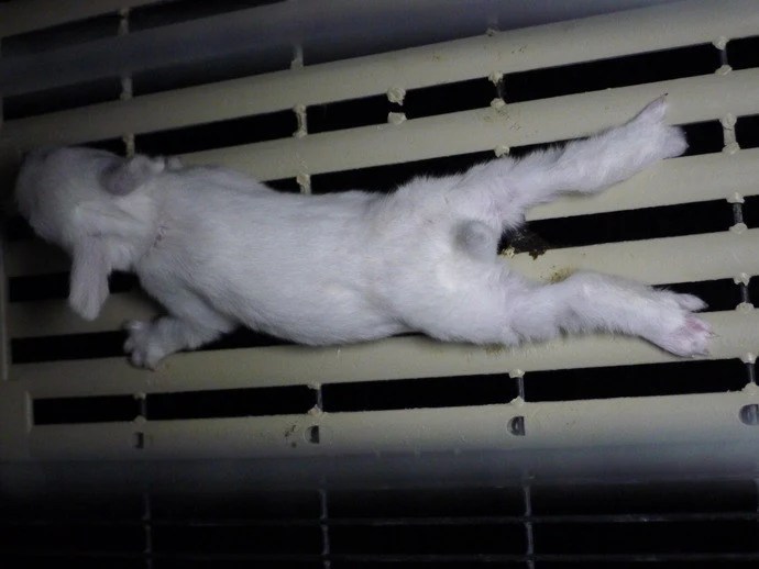 Even keeping them in cages with grid floors is still allowed. At the end of a life full of privation, the rabbits die in the slaughterhouse.