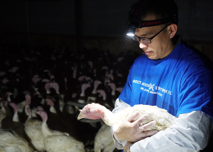 The activists also rescued three turkeys who were clearly suffering from extreme disease and injury and on the brink of death, part of a tactic known as “open rescue,” in which activists choose a symbolic handful of animals from industrial farms who are close to death, provide them with veterinarian care, and then publicly post film of their recovery at a shelter.