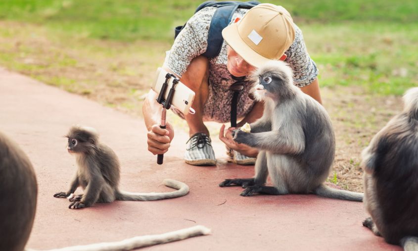 Happy vacationers post pictures of themselves with a monkey on their shoulder, petting a big cat, riding a camel – or even riding an elephant.