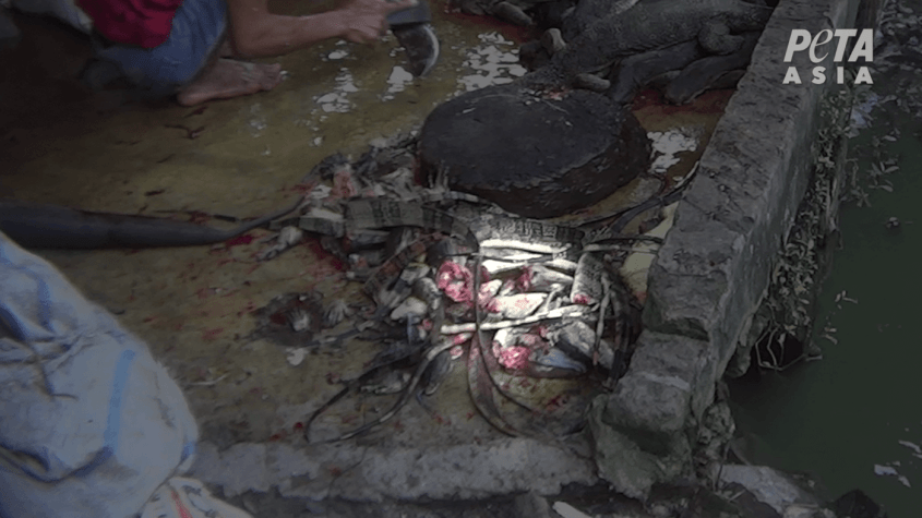 PETA Asia’s investigators documented workers striking lizards up to 14 times with a machete until the decapitation was complete.