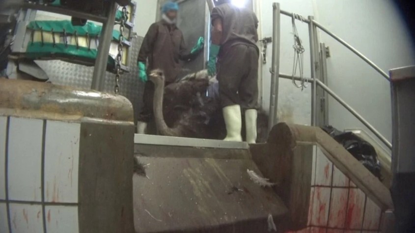 In South Africa, PETA U.S. investigators caught workers on camera striking ostriches in the face during transport, and at the slaughterhouse, they were stunned and flipped upside down, and then their throats were slit in full view of the other terrified birds—all for the bumpy-textured ostrich-skin purses sold by Gucci.