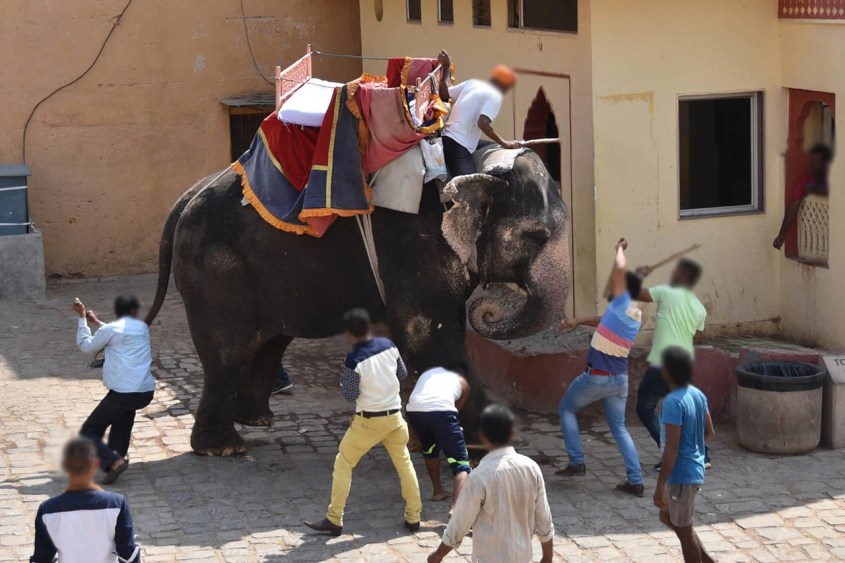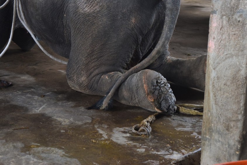 An Amber Fort elephant, with damaged feet from carrying tourists, kneels on a concrete floor