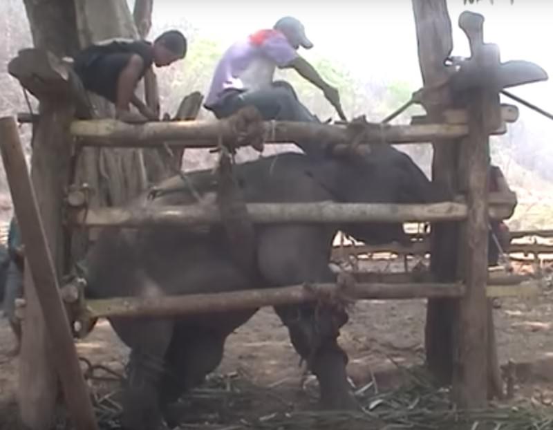 The mahout mostly uses metal hooks that are stuck into the sensitive ears or trunk areas.