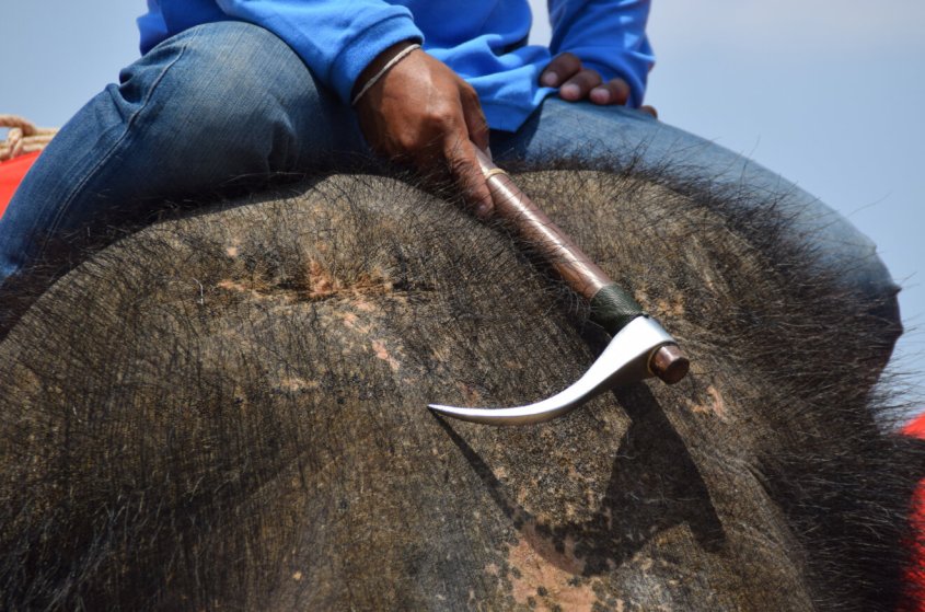 The mahout mostly uses metal hooks that are stuck into the sensitive ears or trunk areas.