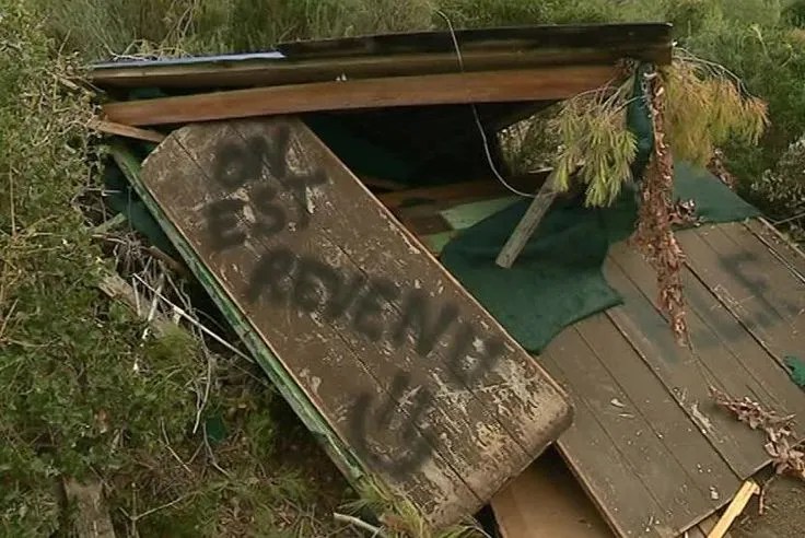 English : Action Stop Hunting Animals in France “The murderers and animal killers are still cracking down, which is why the members of ALF came back to destroy 21 hunting houses. Real structures in nature with concrete roof steel beams … empty cartridges left to pollute the community.