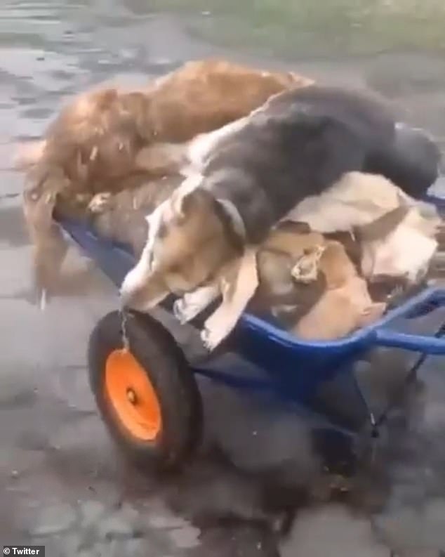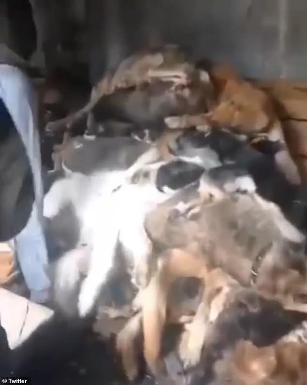 Footage released by the animal shelter on Instagram showed workers stacking up a huge pile of dead hounds which had wasted away in the presence of the occupiers.