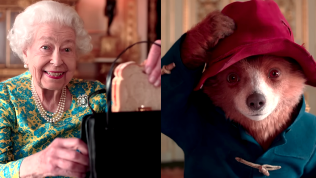 Her majesty joined in the fun by having Paddington Bear to tea, complete with marmalade sandwiches !!