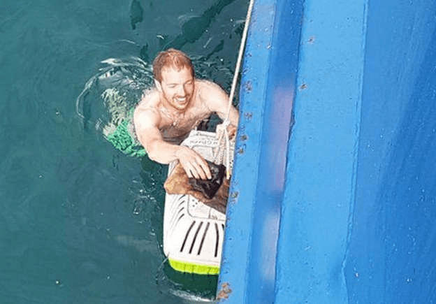Skipper Tom Sexton stripped to his boxers to rescue a meerkat called Boris confused itself for a Lemming and jumped 30ft off the side of the boat.