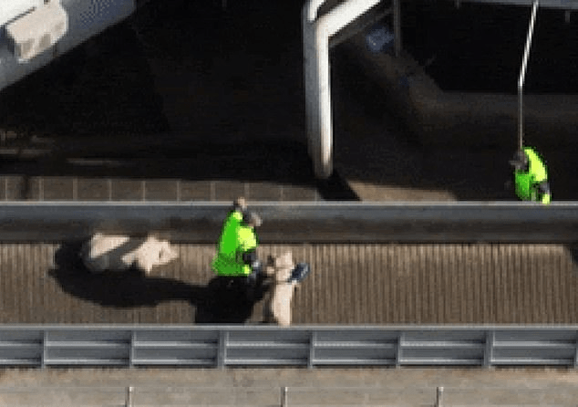 • The aerial vision shows workers allegedly hitting and kicking the pigs before one of the animals is slashed with a knife, causing it to spurt blood.