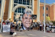 More than 70 animal rights activists stood outside a courtroom in St. George, Utah on Tuesday holding up a giant image of Utah Attorney Gen. Sean Reyes. A word bubble hovered above his head saying “I cover up animal cruelty.”