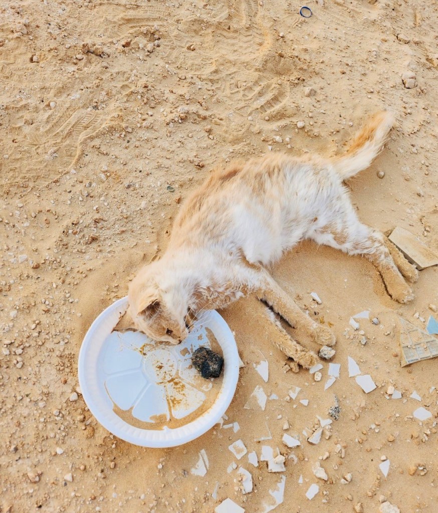 Rescuers in tears found approximately 60 (however they can be much more) dead bodies in different stages of decomposition that were lying on the sand or just beneath the surface. Animals have died enduring unimaginable and unacceptable suffering. Other 92 cats and a dog were luckily found alive but in critical conditions. All very weak and dehydrated they have been transferred to vet clinics for health care.