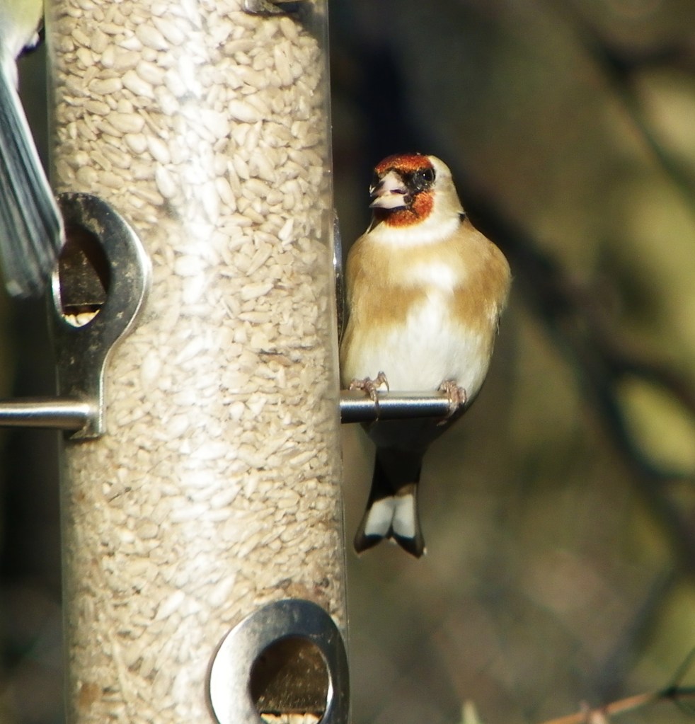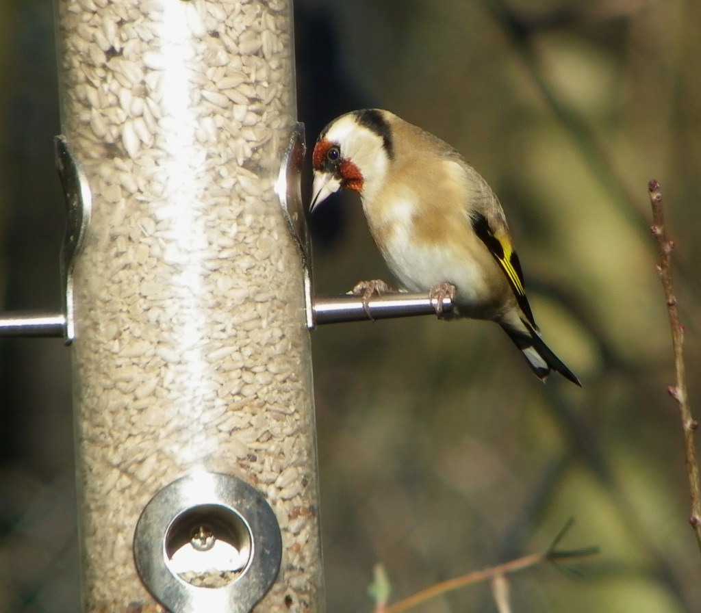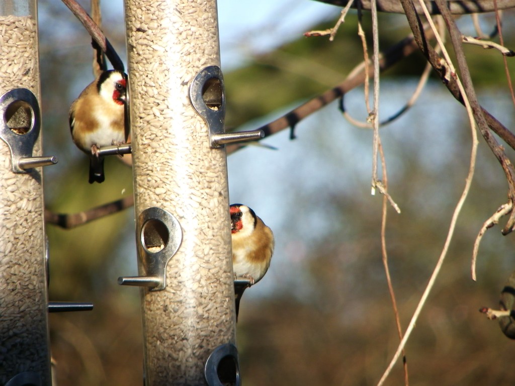 Beautiful Winters day – very cold, but clear with fantastic blue skies. I decided to take some photos of the Goldfinches that come into the garden each day to feast on the Sunflower hearts I put out for them in the feeders, and which you can see packed into the clear feeder tubes in the pictures. Got some ok photos which you can see below. Goldfinches are one of my favorite birds; colours are just amazingly beautiful.