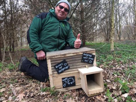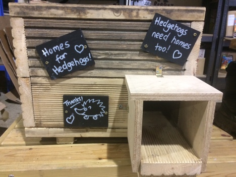 I used to construct hedgehog houses for our local Forestry Commission site. Here is a picture of one of these; and another showing it ‘in the field’ with a ranger. Constructed primarily from old decking it was ideal and thick and weather tough. The protective entrance is an additional to stop and predators getting at the hedgehogs.