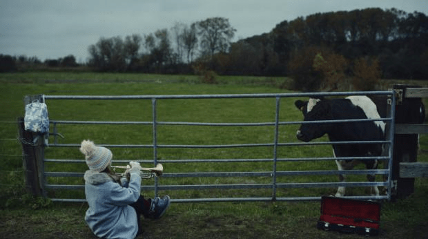 The advert, set to air in cinemas next month, depicts a young schoolgirl stopping to practice Jingle Bells on her trumpet, near a farm she passes on her walk home. There she meets a cow who always comes to the fence to listen.