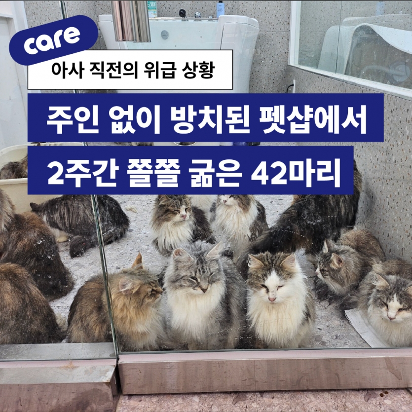 In a harrowing incident in Suwon, South Korea, on December 23rd, CARE received an urgent tip about over 50 dogs and cats that had been abandoned in a closed pet shop for more than six months. These animals had been left to starve for two weeks, with no intervention from local authorities despite numerous complaints from residents. Upon arriving at the scene, CARE found 32 cats and 10 dogs, severely malnourished and covered in feces, barely clinging to life. The heartbreaking sight of the animals, some of them so emaciated their bones protruded, underscored the urgent need for action. The shop owner, currently imprisoned for fraud, had abandoned the animals, and the local government failed to take immediate steps to rescue them.