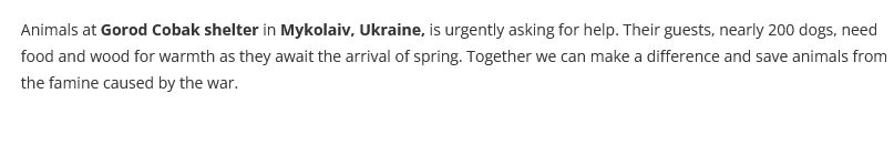 General News, Stray Animals, Uncategorized March 14, 2025 (UA) LET’S HELP ANIMALS IN UKRAINE: FOOD AND FIREWOOD FOR GOROD COBAK SHELTER https://www.oipa.org/international/dogs-food-gorod-cobak-ukraine Posted by oipainternational | Mar 10, 2025 DONATION LINK: https://donorbox.org/let-s-help-animals-in-ukraine-food-and-firewood-for-gorod-cobak-shelter Share this: Click to share on X (Opens in new window) X Click to share on Facebook (Opens in new window) Facebook Like Loading... Related
