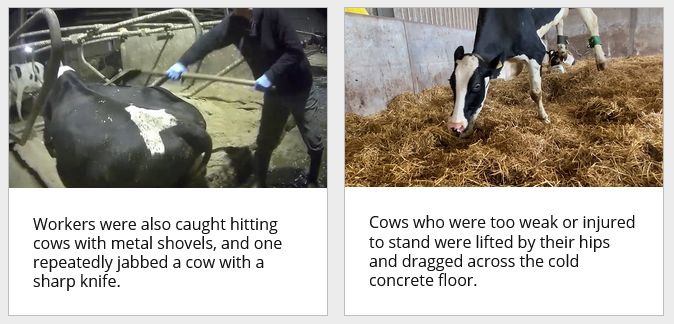 The footage reveals workers punching and kicking cows in the face and stomach, as well as hitting them with sharp, metal shovels. It also shows cows unable to stand being hoisted by their hips with a lift and dragged against the cold concrete floor.