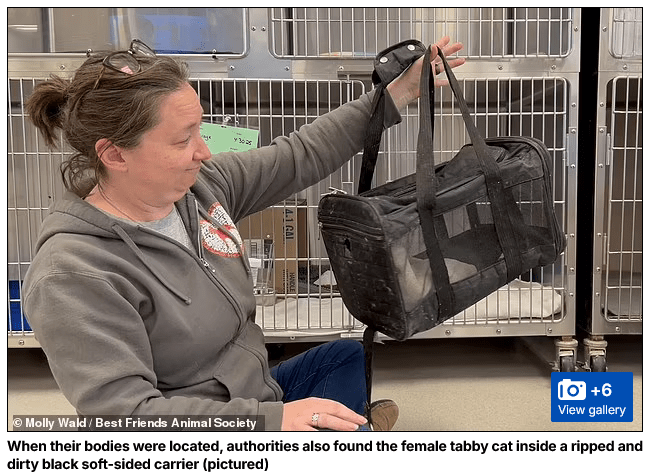 When their bodies were located, authorities also found a female tabby cat inside a ripped and dirty black soft-sided carrier, the Best Friends Animal Sanctuary said.