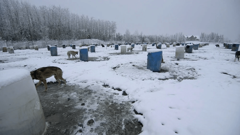 Many of the dogs suffer terribly in the harsh, severe Alaskan environment. They are forced to pull the mushers sled in temperatures which can reach (minus) -100 degrees F when the sub zero temperatures and windchill combine.