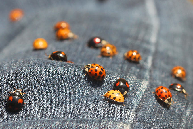 The harlequin ladybird from Asia is now more common than the native species in many regions of Germany.In autumn, the beetles sometimes unite to form large swarms in order to look for winter quarters together.Here some have settled down on the photographer’s pants for a break.– Photo: Helge May